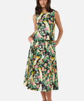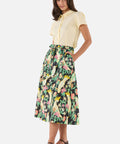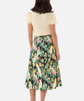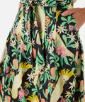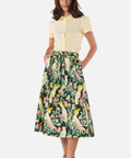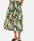 Black a line midi skirt featuring a joyful Australian print of cheeky Sulphur-crested Cockatoos, with beautiful hand painted gum blossoms, banksia, bottlebrush & flannel flowers.