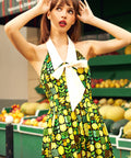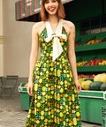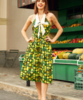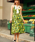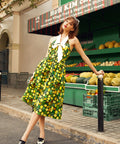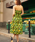 The fitted bodice flows into a swingy midi skirt that’s made for twirling through farmers’ markets, brunch dates, and every spontaneous “let’s go somewhere cute” moment. Finished with a vibrant citrus-inspired print and a comfy shirred back for an easy, flattering fit, this dress is pure joy in outfit form—no sour notes allowed.