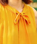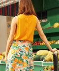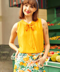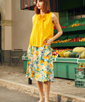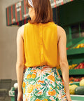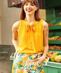 Bright, breezy, and bursting with sunshine energy, the Picnic Perfect sleeveless top from our ModCloth namesake label is basically bottled joy. The softly textured fabric drapes effortlessly, while the tie-neck detail adds a flirt of vintage charm (wear it bow-tied or loose, depending on your mood). Finished with delicate lace trim at the neckline and armholes, it’s the kind of piece that makes even a quick fruit-stand run feel like a main-character moment. Tuck it into denim, or wear it with its matching citrus skirt for a full-on zest fest.