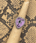 This Handmade Sterling Silver Scorpion Heart Resin Ring by Bog-Art-Studio features a real scorpion encased in heart-shaped resin, symbolizing resilience, transformation, and protection. The scorpion is framed by a scalloped bezel with twisted deco wire details, adding vintage elegance and artistic texture. The adjustable band ensures a comfortable fit, making it a bold, nature-inspired statement piece that embodies personal strength and empowerment.