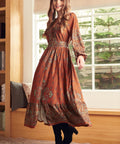 Wrap yourself in the warmth of nostalgia with the Goldie Hour Midi Dress. This piece from our ModCloth namesake label exudes a rustic charm with its terra cotta paisley pattern on soft knit fabric. Balloon long sleeves and a smock panel enhance its vintage flair, while pockets add a touch of modern functionality. Its medium stretch fabric and v-neckline adorned with button details make it a cozy yet chic choice for winter get-togethers or a romantic evening at the drive-in.