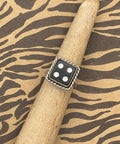 Handmade in California by Bog-Art-Studio, this sterling silver dice ring features a genuine, vintage 1950's die, set in a serrated bezel, framed by twisted deco wire. The adjustable size ensures a comfortable fit for any wearer. Symbolizing luck, fate, and boldness, dice represent the thrill of risk and opportunity. Inspired by the spirit of Las Vegas, this ring is a stylish tribute to fortune, adventure, and embracing life's possibilities.