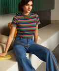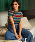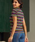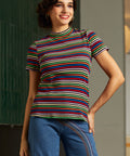 Dive into the autumn season with the Whispers of Autumn Mock Neck Top from our ModCloth namesake label, where comfort meets playful vintage flair. Crafted from a knit fabric that hugs your curves just right, thanks to its medium stretchability, this top is a dream to wear. Featuring a charming mock neck and sporty short sleeves, it's rendered in vibrant rainbow shades for a look that's both cozy and spirited. Perfect for pairing with high-waisted jeans for a casual day out, or layer it under a pinafore dress for a more whimsical ensemble. This versatile piece promises to be your go-to for chilly fall adventures and beyond.